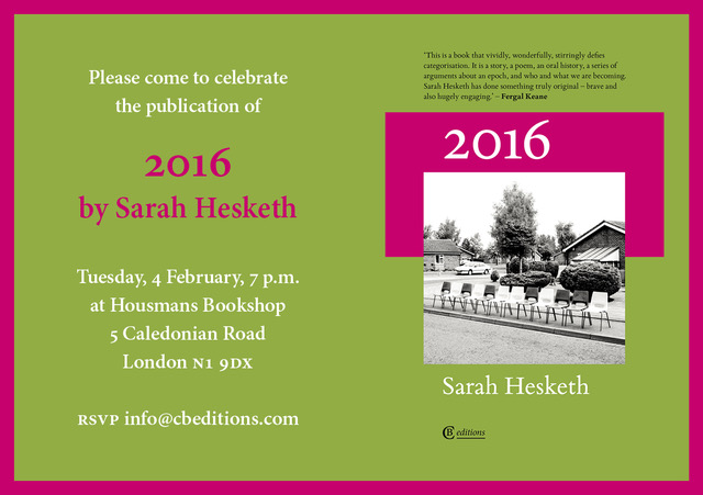 « All Events This event has passed. 2016 by Sarah Hesketh: Publication Party Tuesday February 4, 2025 @ 7:00 pm – 9:00 pm Please note that this is an externally organised event. Please RSVP info@cbeditions.com to attend. Add to calendar Google Calendar iCalendar Outlook 365 Outlook Live