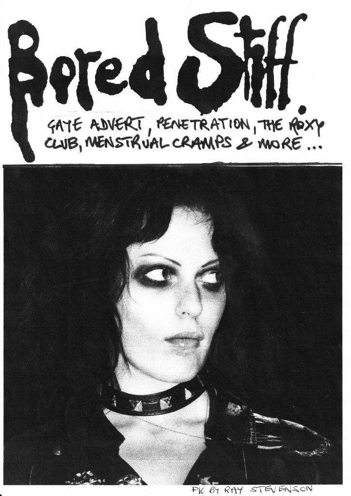 With the help of Martin Hand – a graphic designer, Bored Stiff contains interviews with band members from the likes of The Adverts, Penetration and the Menstrual Cramps as well as folk such as Andrew Czezowski and Susan Carrington who created the Roxy and Vortex punk clubs.