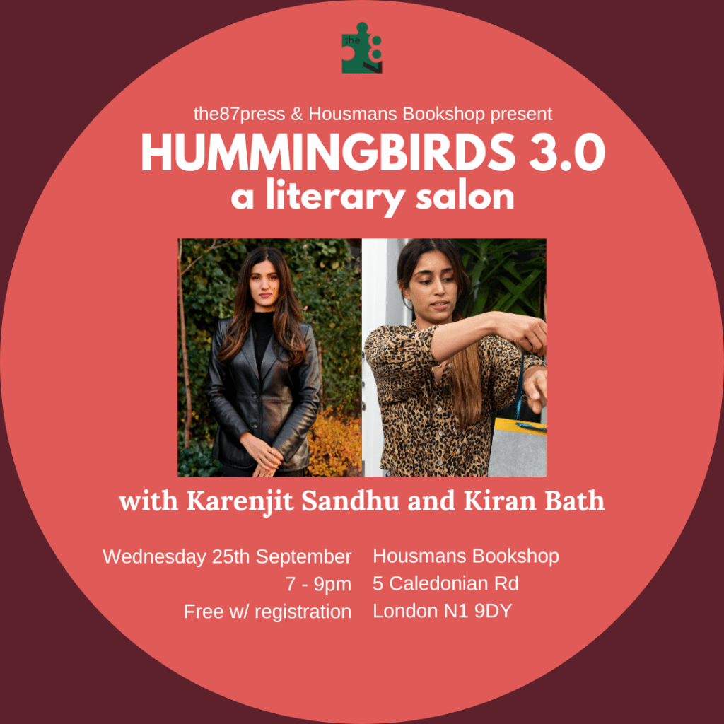 Hummingbirds 3.0 brings together two writers from the Punjabi diaspora, Karenjit Sandhu and Kiran Bath (making a special visit from the US). In celebration of Karenjit’s and Kiran’s debut collections of poetry, this reading will celebrate diaspora as a space for feminist politics, intersectionality, performance on and off the page. Each poet will read and be in conversation, chaired by director of the87press, Azad Ashim Sharma.