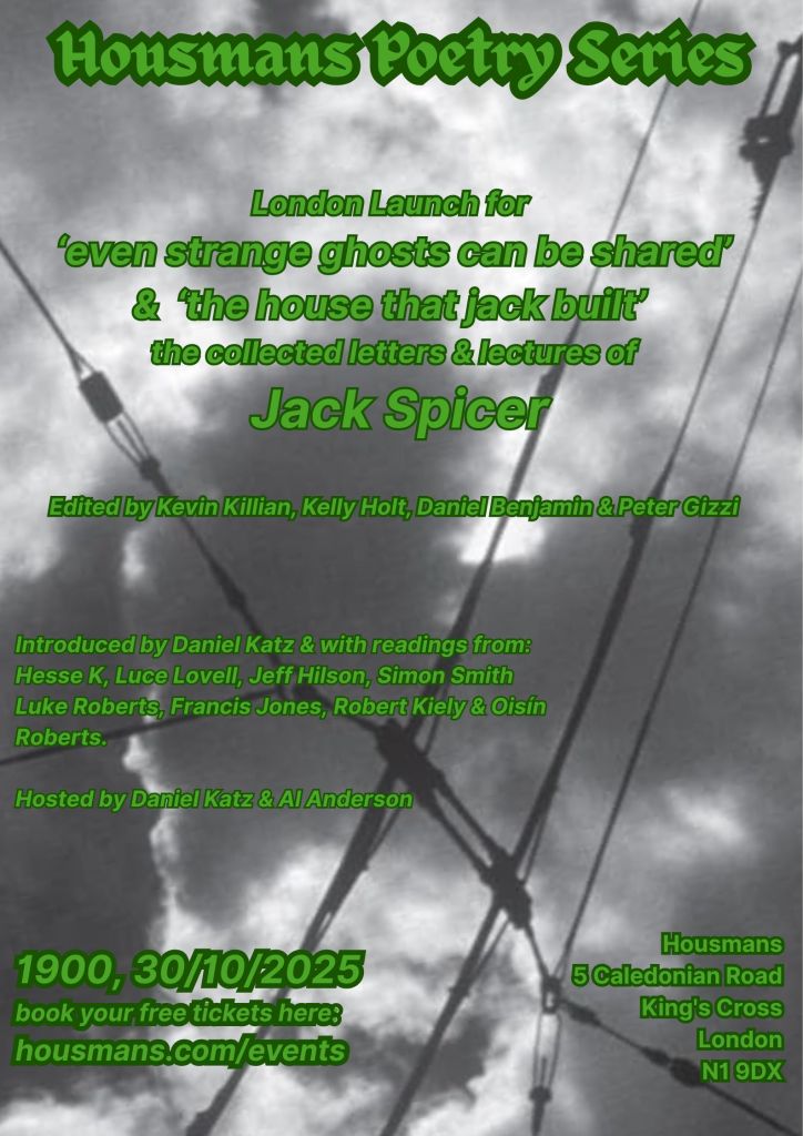 For the second installment of our October poery series we once again celebrate the much underappreciated 20th century American poet Jack Spicer, after our sold out event for the uncollected poems last year. This time we launch two books: the collected letters and lectures,which will be either read from, or responded to by, a host of some of the most exciting poets working in the UK and Ireland today.