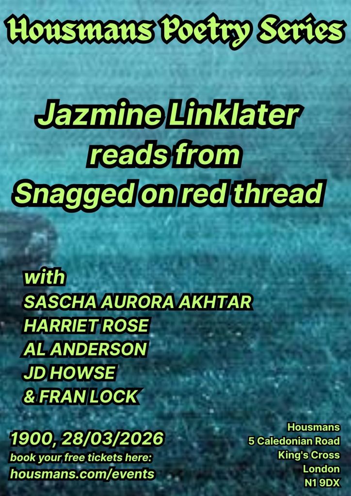 Please join us for our second poetry night of the year. This time we celebrate Jazmine Linklater’s immense and devastating new long poem ‘Snagged on red thread’ (published by Monitor). Reading alongside Jazmine we have Fran Lock, Sascha Aurora Akhtar, Al Anderson, Harriet Rose and JD Howse.