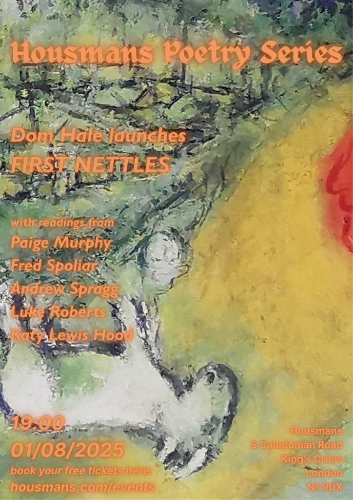 We are delighted to welcome back to the shop Dom Hale; a co-organiser of the Poets Hardship Fund, publishing great work at Chaff and one of our finest poets. Dom will be launching his new collection ‘First Nettles’ published by The Last Books. Joining Dom we have Fred Spoliar, Paige Murphy, Luke Roberts, Andrew Spragg and Katy Lewis Hood.