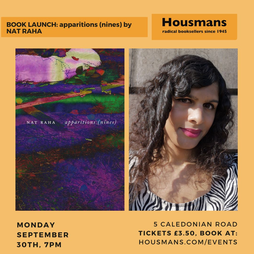 We are very, very excited to be welcoming the legendary poet Nat Raha to Housmans for the official UK launch of her new book, apparitions (nines). A vital figure in UK, and wider Anglophone, vanguardist poetry for many years Raha’s newest experiment in lyric writing promises to be characteristically invigorating.
